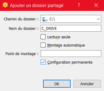 Je ne recommande pas de donner à une VM l’accès à vos disques durs. Cependant, dans certains cas c’est nécessaire. Cette partie décrira la méthode pour lier les disques durs entiers. Si vous souhaitez transférer des fichiers de votre ordinateur à votre VM, je vous conseille de faire la même chose mais avec un dossier en particulier plutôt que les disques durs entiers. Avant de démarrer cette étape, je vous conseille d’activer le presse-papier bidirectionnel et le glisser-déposer bidirectionnel dans la barre de contrôle, “Périphériques”. Dans la barre de contrôle, “Machine”, “Configuration”, “Dossiers partagés”. Cliquez sur le dossier bleu avec un + vert à droite. Dans chemin du dossier, vous pouvez chercher un dossier en particulier ou bien partager directement votre (vos) disque(s) dur(s). Pour cela, Il suffit de taper le chemin du disque ou du dossier puis cocher “configuration permanente” et “Montage automatique”.
